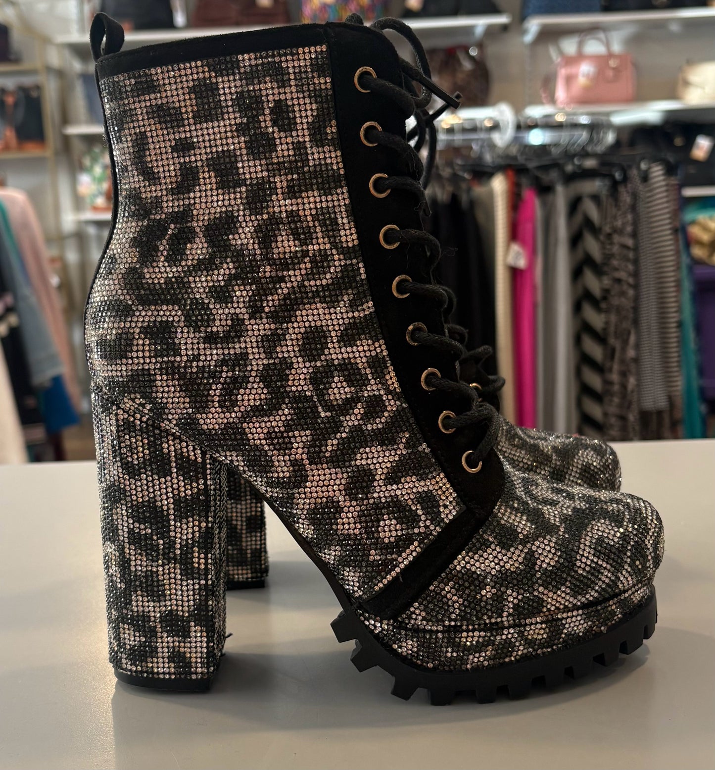 It's Fashion Cheetah Print Rhinestone Embellished Bootie Platform Heels Size:7M