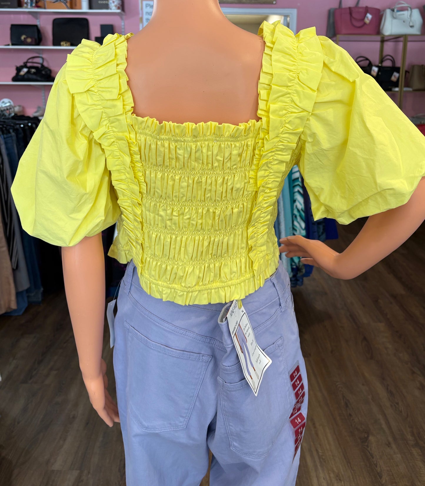 endless rose Women's Yellow Smocked Puff Sleeve Top Blouse Size Medium